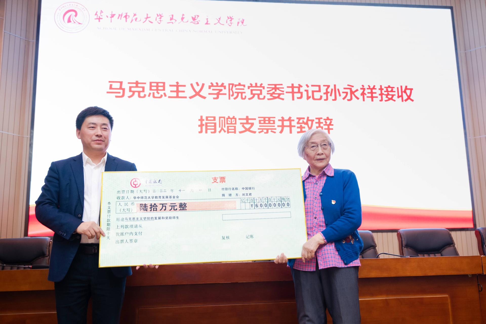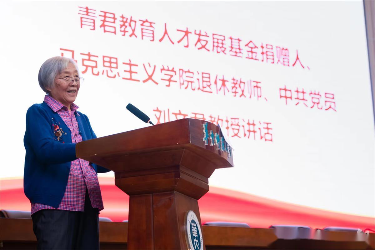 “我今年86岁,过去的86年,前18年是在河南,剩下的68年是在武汉、在华师,更确切地说,是在马院。”捐赠仪式上,“青君教育人才发展基金”捐赠人、马克思主义学院退休教师、中共党员刘文君教授深情回顾了往昔时光,回顾了她在华师、在马院的温情岁月。观看了党的二十大开幕会后,刘文君就明确表达要为党、为华师、为马院再尽自己一份力。“我是在马克思主义学院锻炼成长的,在感谢的同时,也希望这个宣传马克思主义的阵地更加繁荣昌盛。”老人动情地说。