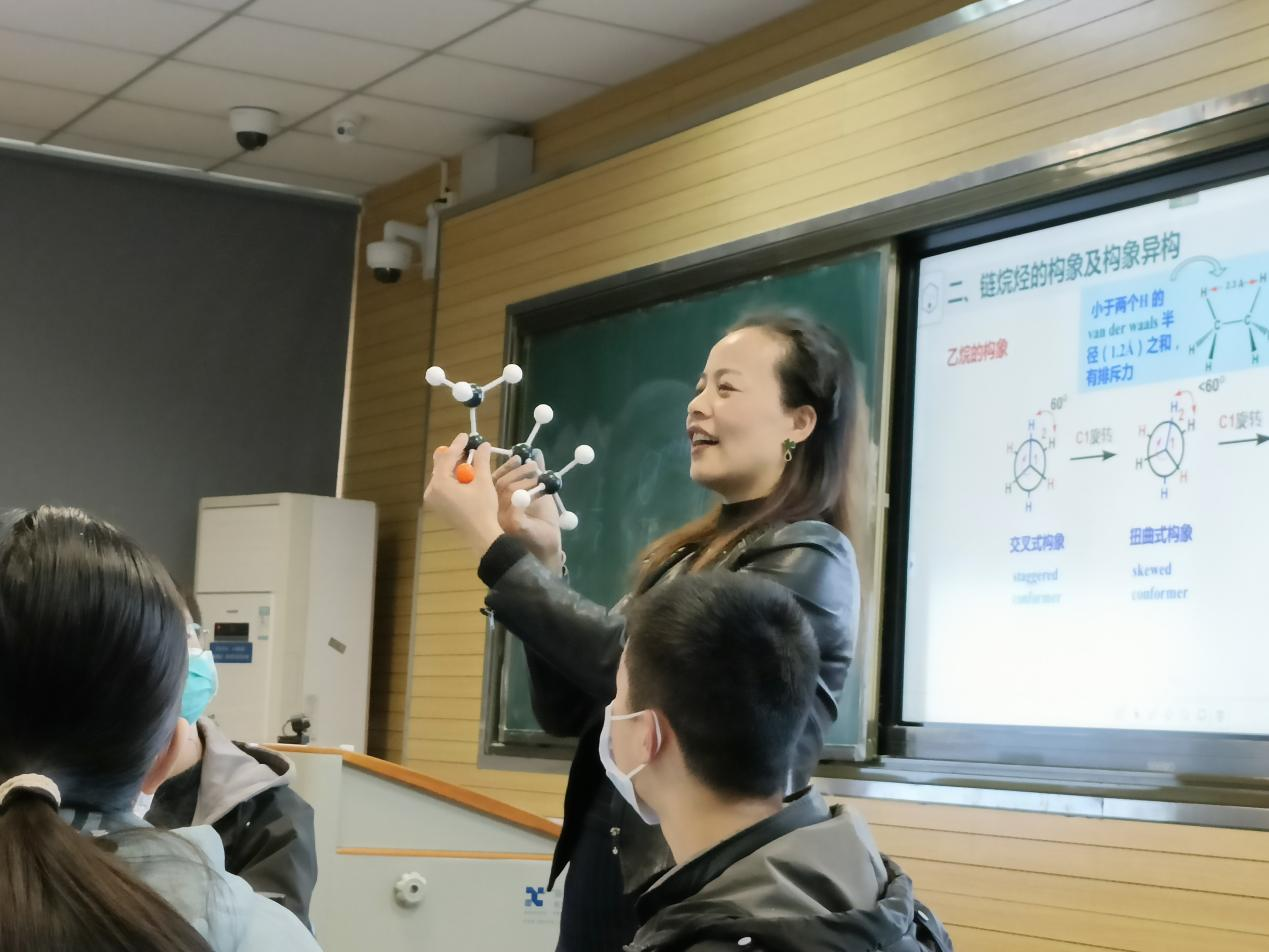 在“大思政”背景下,佘能芳作为一名专业课教师主动抓住课堂教学“主渠道”,挑起“思政担”,将有机化学课程上出“思政味”。她认为,对于专业课教学来说,深挖课程内容中的思政素材,拔高课堂教学的思想高度,做好专业课与思政内容的同向同行,对学生的成长成才尤为重要。课堂上的佘能芳紧扣“课程思政”的育人主线,围绕“知识传授、能力培养、价值引领”的三维育人目标,对有机化学课程思政进行了有效探索。一场课前学生自画像、一堂“芳话有机”导入课、一次满是中国红的爱国主义教育、一段充满化学知识的vlog、一次专业与艺术结合的节目表演、一场满载回忆的结课仪式,让她的课堂充满思政特色。