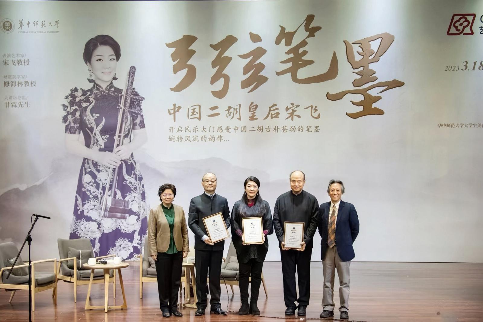 华大在线讯(记者 邹媛奕 见习记者 李思彤)3月18日,我校第二届“艺美大讲坛”活动在音乐厅举行。被誉为“中国二胡皇后”的著名二胡演奏家宋飞应邀担任主讲表演艺术家。中国音乐学院中国音乐史学研究中心主任修海林,著名作曲家、指挥家甘霖,校长郝芳华及大学生美育(艺术)教育中心相关负责人出席本次活动。郝芳华为三位艺术家颁发大学生美育(艺术)教育中心艺术咨询委员会委员聘书。