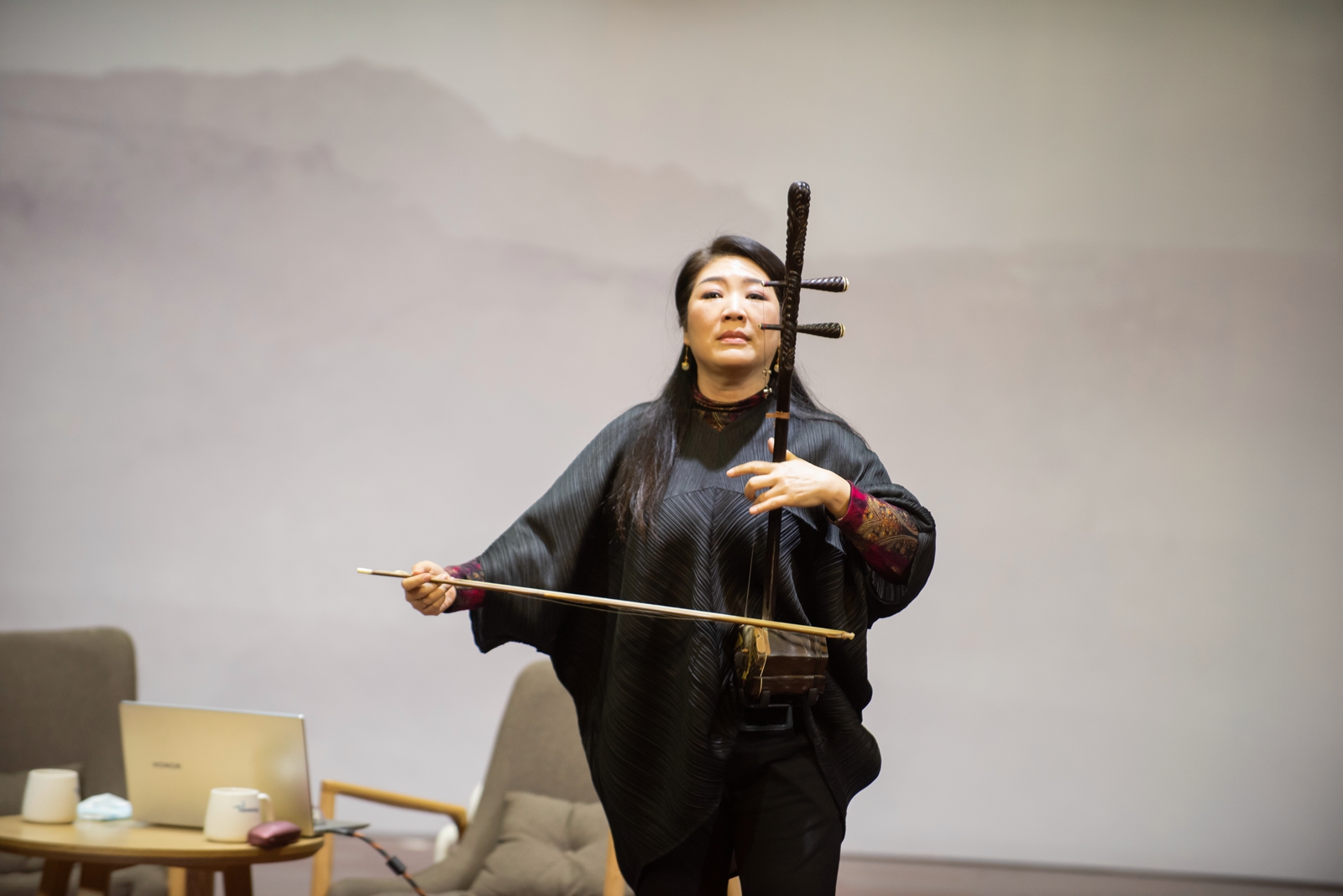 一首经典的《空山鸟语》二胡演奏曲为现场师生带来了听觉上及心灵上的双重享受,宋飞以纯熟的技术和精湛的手法,将观众引入“空山不见人,但闻鸟语声”的山水意境中。“娘的眼泪似水淌,点点洒在儿的心上……”婉转凄哀的唱调与如泣如诉的二胡交相呼应,将一首感人至深的曲子《娘的眼泪》表现得淋漓尽致,也向观众展示了表演者如何深入把握乐曲中的细腻情感并将其融入演奏。