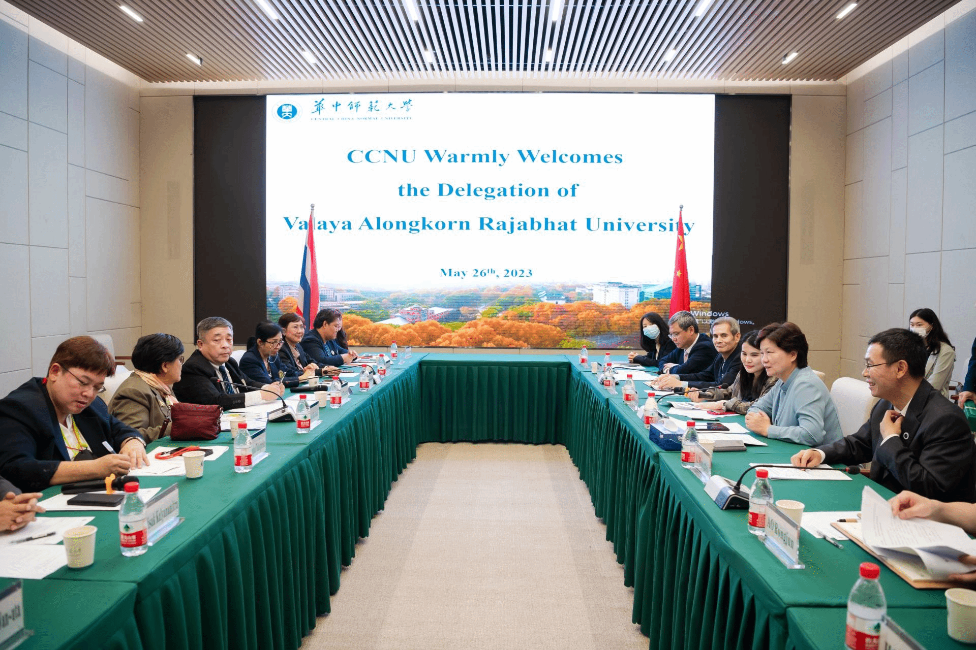 此次是Sombat Kotchasit校长继2016年首次来访后,再次率团访问我校。瓦拉亚隆宫皇家大学教学副校长Pannraphat Takolpuckdee、行政科研副校长Orasa Charoontham和常务副校长Pisak Kalyanamitra陪同来访,该校管理科学学院、教育学院、创新管理学院、科学技术学院、国际事务处及我校国际合作与交流处、国际文化交流学院、城市与环境科学学院、公共管理学院相关负责人参加座谈。会前,代表团参观了南湖校区智慧教室、教育大数据应用技术国家工程研究中心及校史馆,并与我校相关单位进行了深入交流。