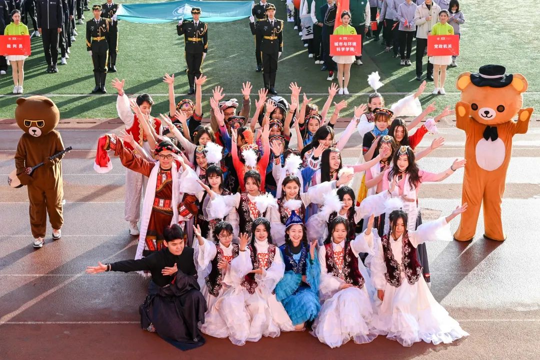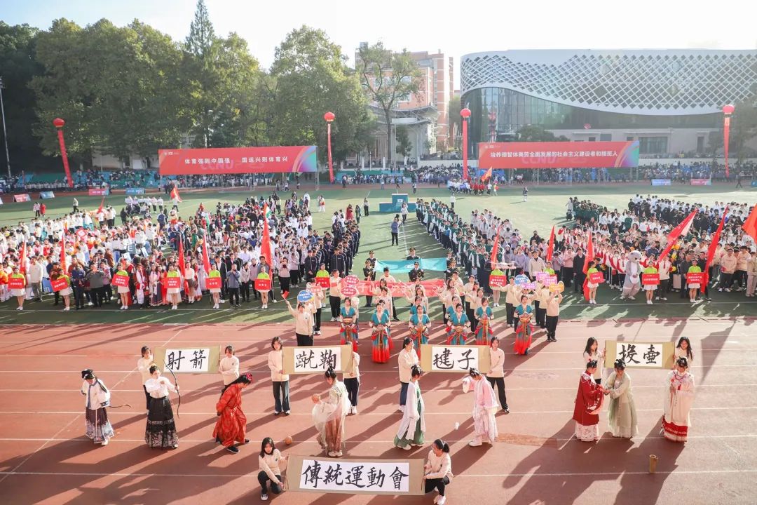 开幕式上,各代表队身着各学院特色服装,迈着铿锵有力的步伐,依次亮相。少数民族预科班代表队身着民族服饰,载歌载舞,热情洋溢;校医院的工作人员手举“急救先锋、守护生命”的标语,承诺在运动会期间做好运动员的坚实后盾;“知华、友华、爱华”,国际交流学院学子热情地挥舞各国旗帜,尽情表现对华师的热爱;跳跃、转体、后空翻,音乐学院学子以婀娜但不失力量感的舞姿展现体育魅力……各具特色的方阵表演让现场掌声不断。