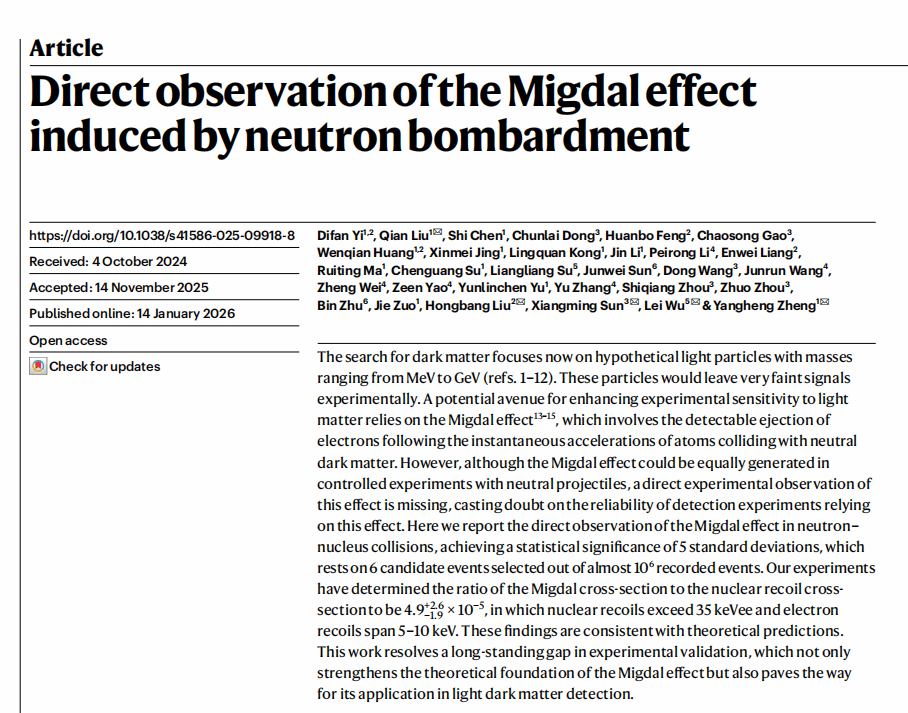 华大在线讯(通讯员 孙向明 汪聪)近日,国际顶级学术期刊《自然》发表一项重大物理突破——中国科学院大学领衔联合广西大学、开云网页版登录入口等多所高校科研团队协同攻关,首次成功实现了对苏联科学家于80余年前预言的“米格达尔(Migdal)效应”的直接实验观测。这一成果为轻暗物质探测突破阈值瓶颈提供了关键支撑,实现该突破的核心硬件——像素读出芯片Topmetal-II,由开云网页版登录入口PLAC实验室自主研制。我校为该研究的核心合作单位之一,物理科学与技术学院孙向明教授、王东教授和高超嵩教授参与研究,孙向明为共同通讯作者。