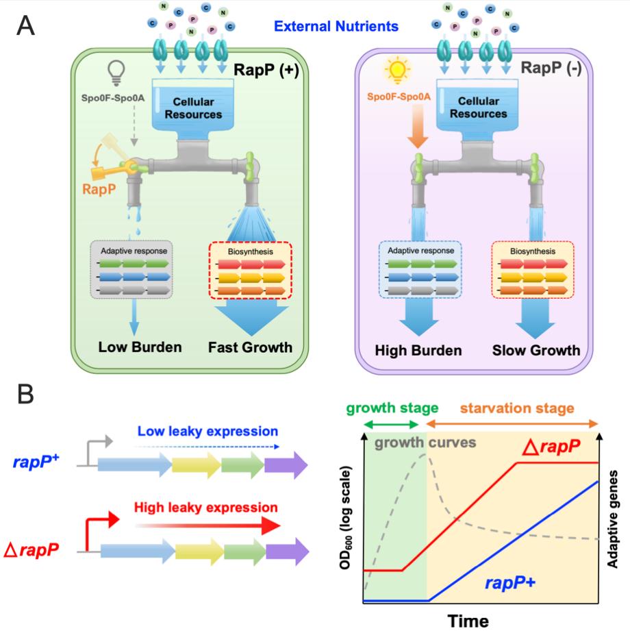 图示:RapP蛋白帮助芽孢杆菌统筹优化生长调控与环境适应,破解“鱼与熊掌不可兼得”难题