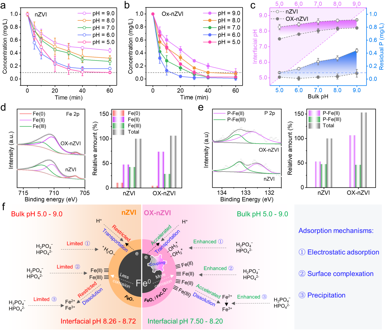 图3 nZVI / OX-nZVI在不同初始pH值下的除磷性能、界面酸度与除磷机理