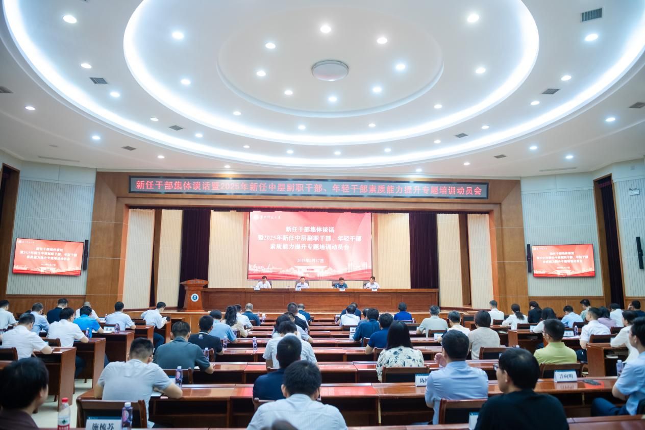 华大在线讯(通讯员 张琳)为深入贯彻中央八项规定精神学习教育,加强年轻干部锻炼培养,6月17日,学校在科学会堂一楼报告厅召开新任干部集体谈话暨2025年新任中层副职干部、年轻干部素质能力提升专题培训动员会。校党委书记夏立新,校长彭双阶,校党委副书记陈迪明,校党委副书记、纪委书记刘继文出席并讲话,学校新提任中层干部、2025年武汉市挂职干部、校内实践锻炼青年干部人才以及相关单位负责人参会,会议由陈迪明主持。